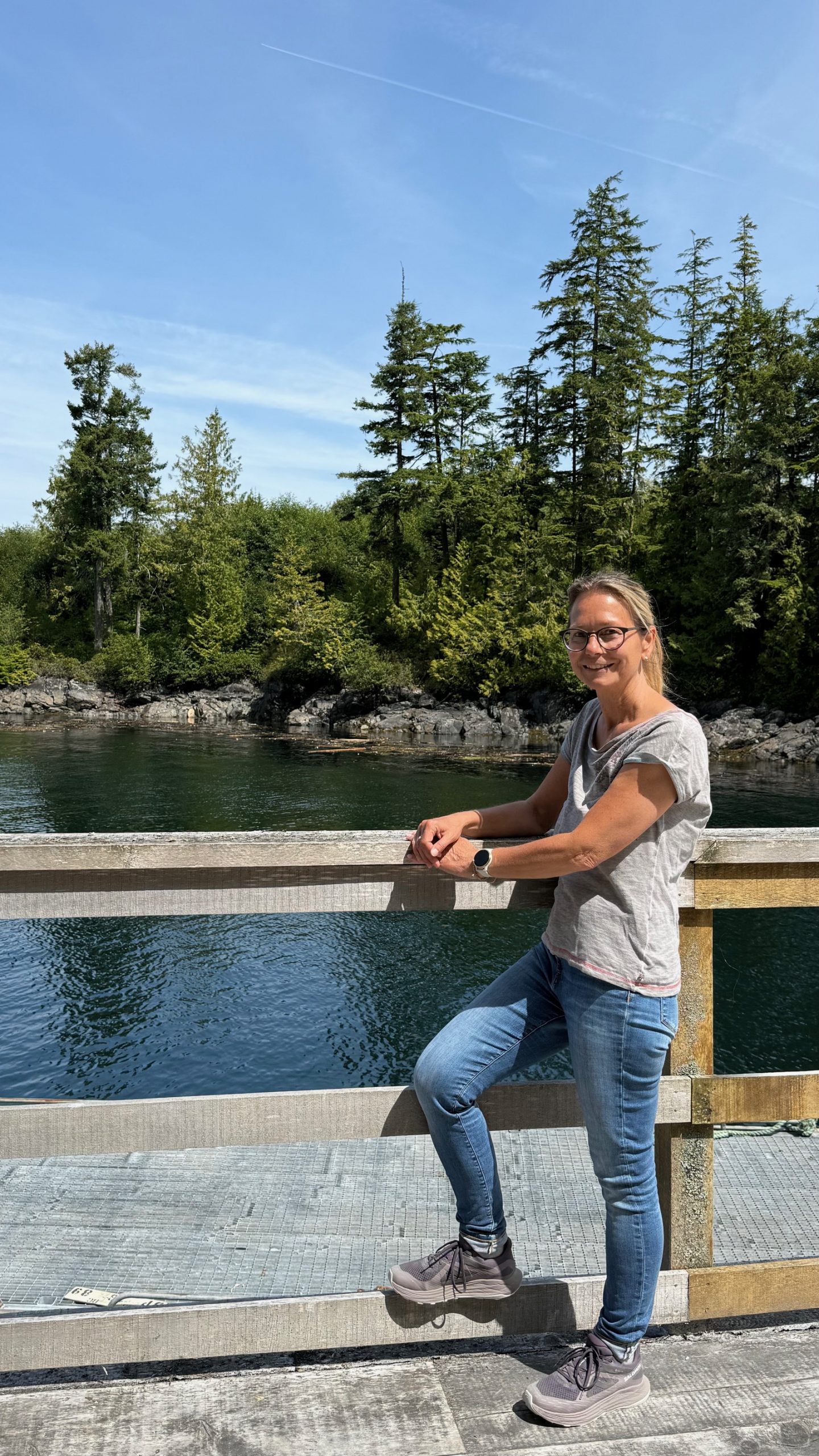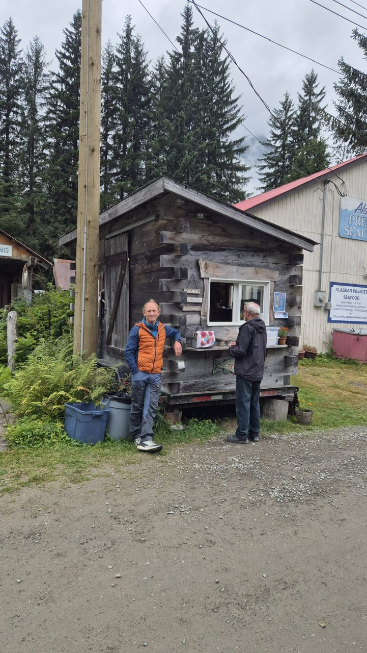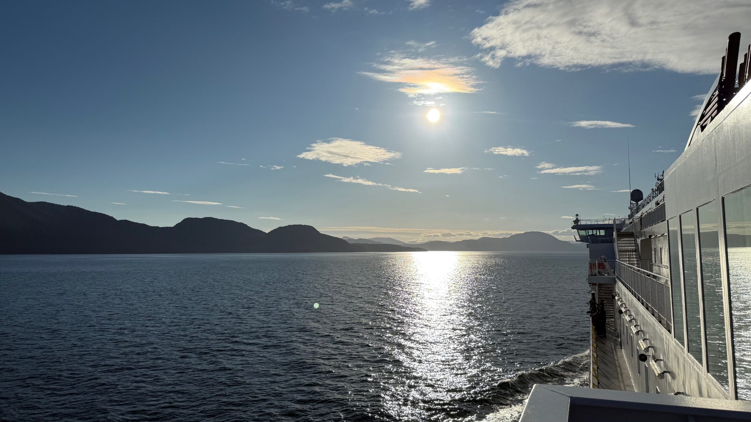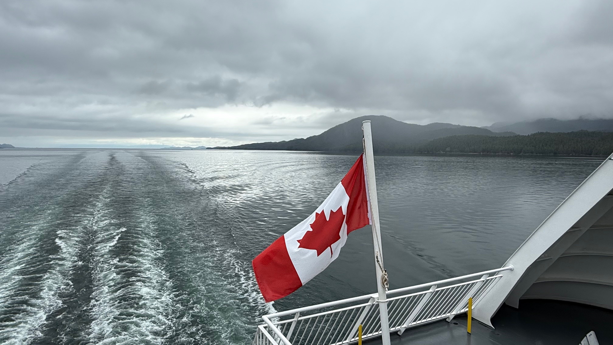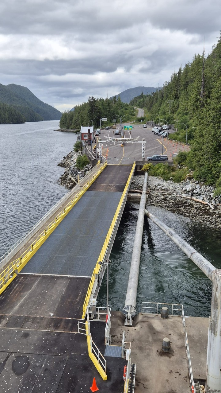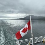 Nach drei Tagen sind wir dann nach Port Hardy gefahren. Hier hat uns auf dem Campingplatz ein wildfremder Mann einen frisch gefangen Lachs geschenkt. Der war sogar schon in einer Honig-Dill Sauce eingelegt und hat köstlich geschmeckt. Die Kanadier sind alle so freundlich. Wir würden gerne die Fähre von Port Hardy nach Prince Rupert nehmen. Diese Fähre ist in der Hauptsaison über Wochen ausgebucht und wir waren auf einer Warteliste. Wir sind dann einfach am Samstagmorgen um 5:00 Uhr zum Fährhafen gefahren und durften dann als letzte, 5 Minuten vor Abfahrt auf das Schiff fahren. Diese Überfahrt dauert 15 bis 17 Stunden. Sie führt durch die kanadische Inside Passage und gilt als eine der schönsten Wasserstraßen der Welt. Sie bietet atemberaubende Landschaften, Fjorde, Regenwälder und Gletscher. Wir haben bestimmt 20 Buckelwale, Orcas und Delfine gesehen.