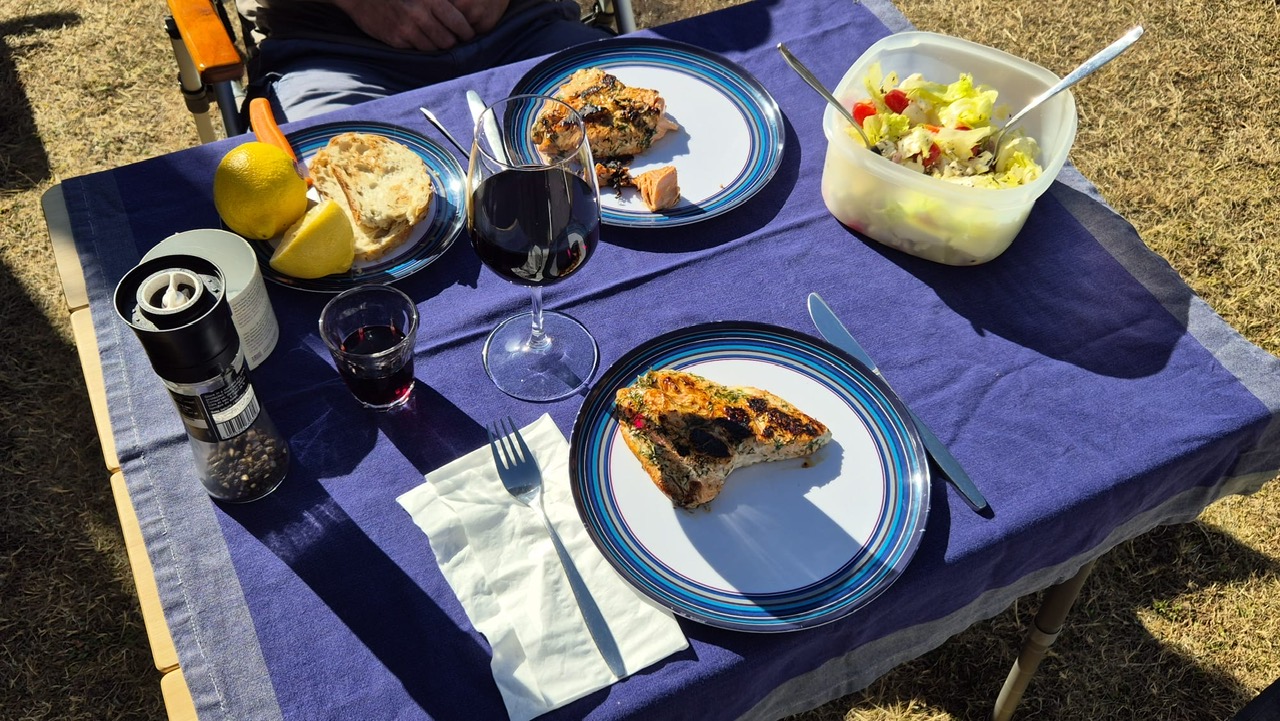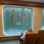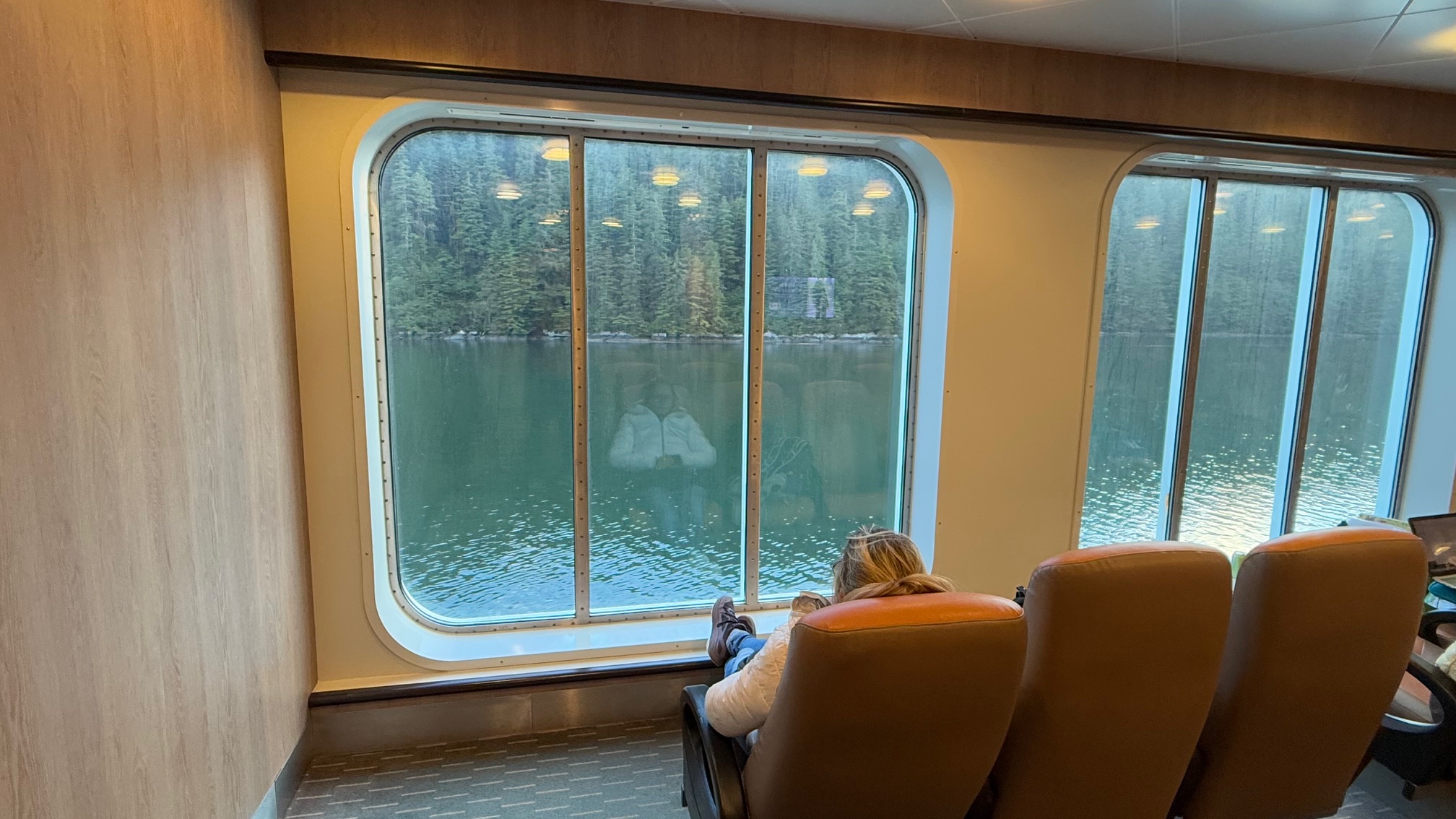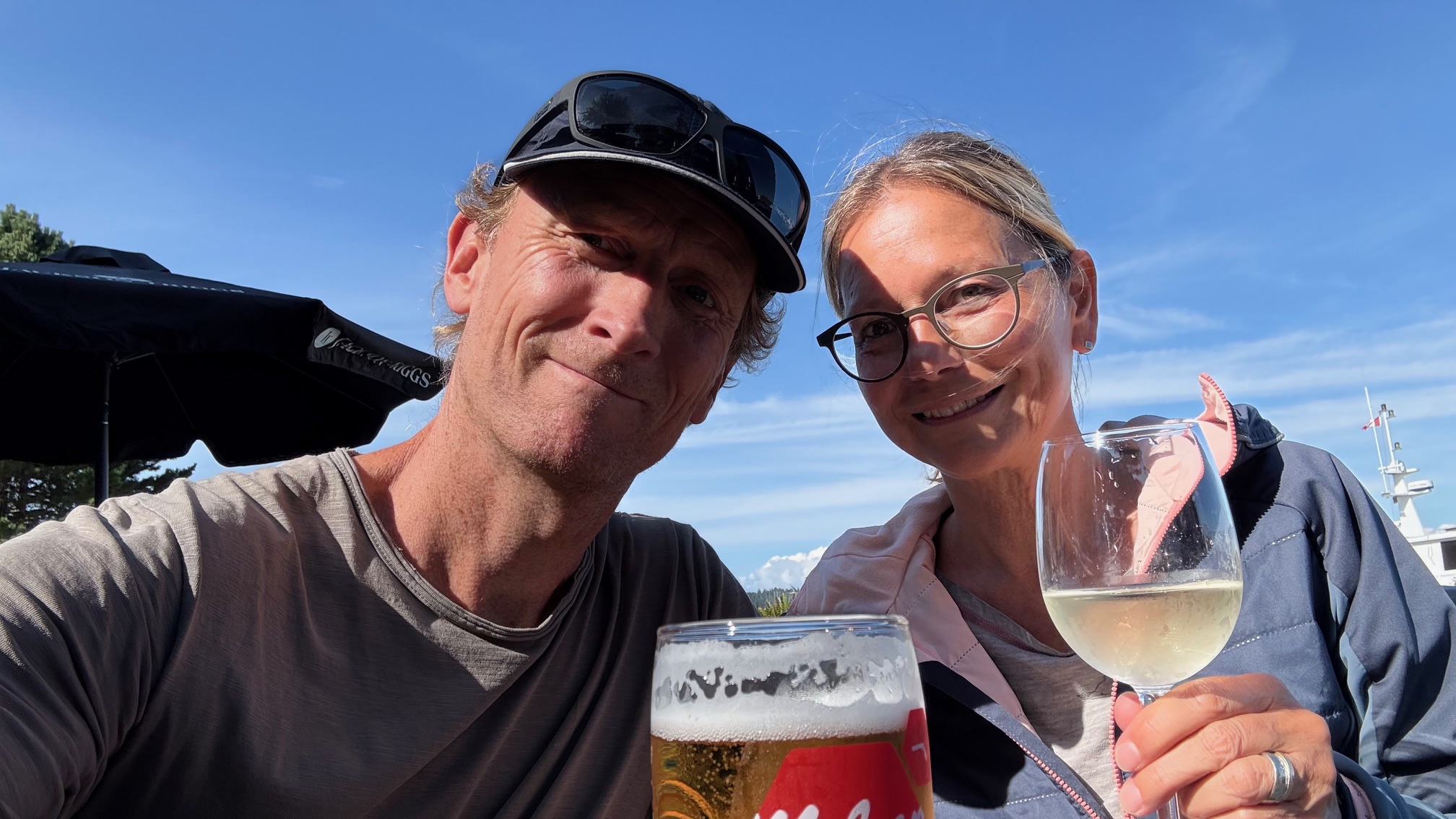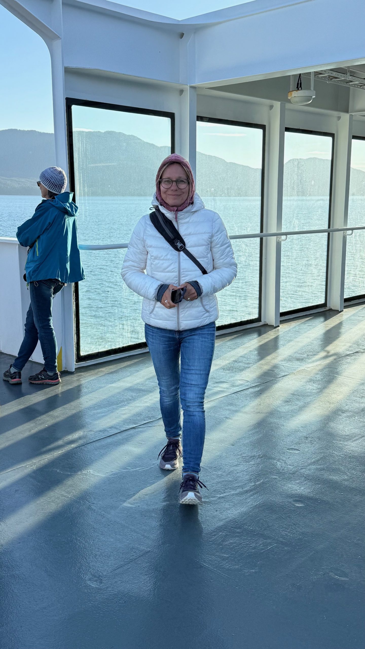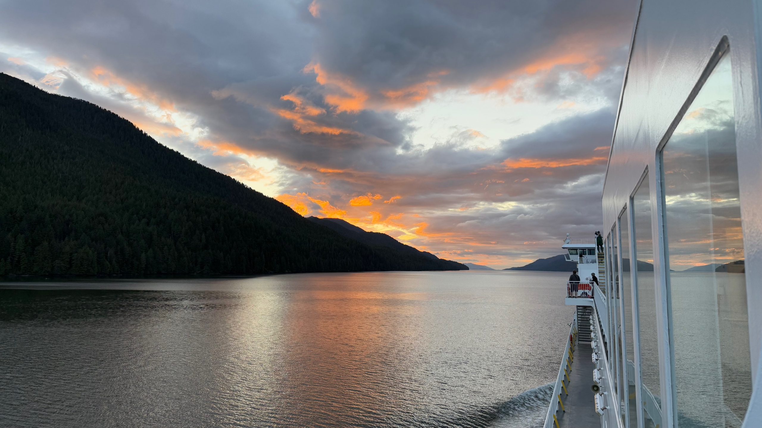 Nach drei Tagen sind wir dann nach Port Hardy gefahren. Hier hat uns auf dem Campingplatz ein wildfremder Mann einen frisch gefangen Lachs geschenkt. Der war sogar schon in einer Honig-Dill Sauce eingelegt und hat köstlich geschmeckt. Die Kanadier sind alle so freundlich. Wir würden gerne die Fähre von Port Hardy nach Prince Rupert nehmen. Diese Fähre ist in der Hauptsaison über Wochen ausgebucht und wir waren auf einer Warteliste. Wir sind dann einfach am Samstagmorgen um 5:00 Uhr zum Fährhafen gefahren und durften dann als letzte, 5 Minuten vor Abfahrt auf das Schiff fahren. Diese Überfahrt dauert 15 bis 17 Stunden. Sie führt durch die kanadische Inside Passage und gilt als eine der schönsten Wasserstraßen der Welt. Sie bietet atemberaubende Landschaften, Fjorde, Regenwälder und Gletscher. Wir haben bestimmt 20 Buckelwale, Orcas und Delfine gesehen.