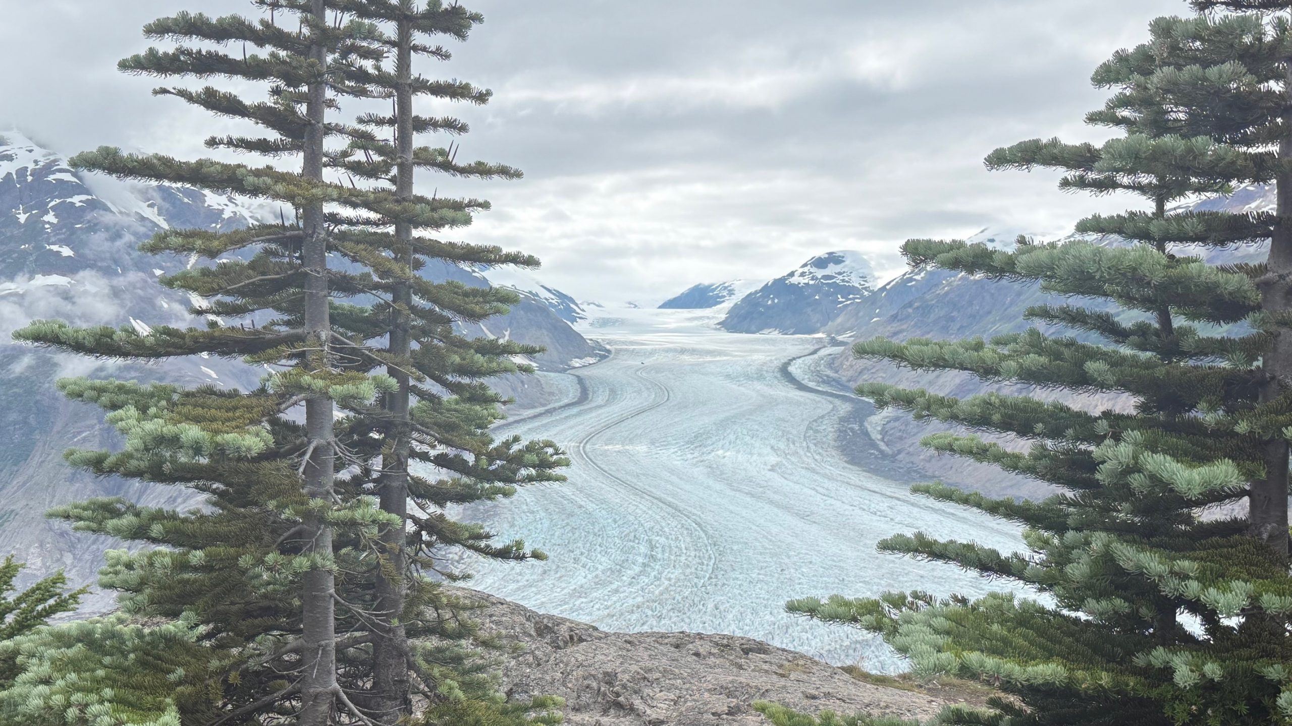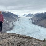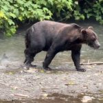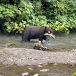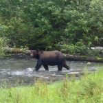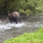 Am zweiten Abend kam dann ein Grizzly den Bachlauf hoch gewandert und hat sich einen Lachs nach dem andern gefangen. Ein ortsansässiger Ranger meinte noch, das dieser Grizzly heute das erste mal da ist und wir sollen uns sehr ruhig verhalten dann ist alles kein Problem. Am Abend zuvor war wohl ein Grizzly da, den hat es gar nicht interessiert, dass er so viele Zuschauer hatte. Den ganzen Tag stehen viele Leute auf diesem Holzsteg rum und warten auf das beste Foto oder den Film. Das war schon sehr bewegend, einen Grizzly beim Lachsfangen zu sehen. Aber das Warten hat sich gelohnt. Grizzlys sind sehr wählerisch, sie fressen am liebsten Lachsweibchen, die noch nicht gelaicht haben. Meistens schlitzen sie einfach den Bauch auf und fressen nur die Eier…Von dort sind wir dann noch 50 km weiter gefahren zum Salmon Gletscher. 😉